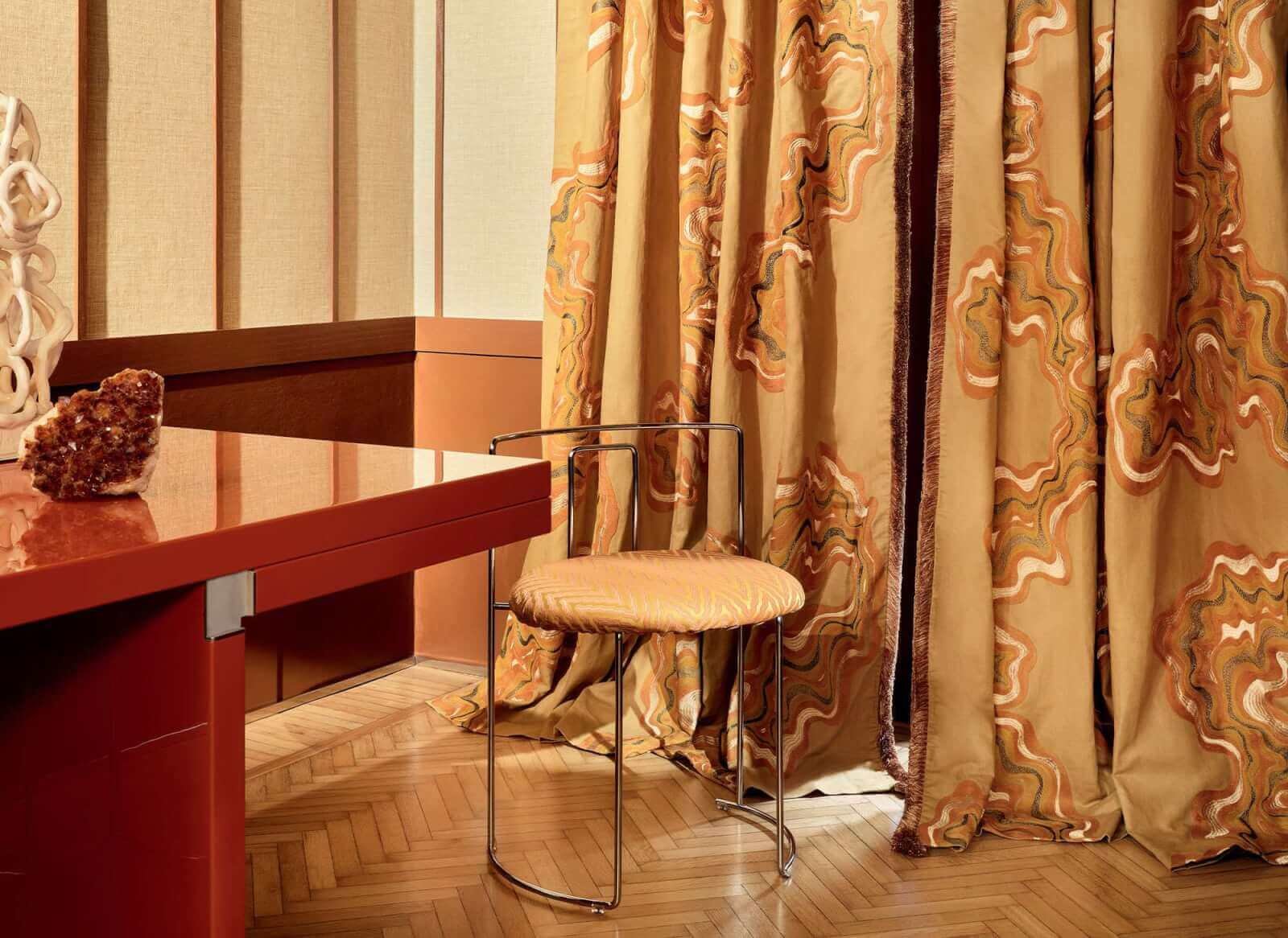 A kollekció neoklasszicista stílusjegyekkel csillog, mintha milánói környezetből származna. A Porta Venezia negyed villái és titkos helyei határozottan ornamentális alkotásoknak adják át varázsukat. Az olasz paloták márványmunkáira emlékeztetve, geometrikus csillogásukkal, a kifinomultság és az anyagok finom kombinációival, hímzéssel és szövéssel preziosa aurát sugároznak. A nyomtatott vagy szőtt bársonyok eleganciával borítják be belső tereinket, a nagy minták matt és fényes játékukkal teátrális hatást keltenek, a kis minták pedig a tökéletes eleganciát harmonizálják. Az értékes műselyem taft változó fényével kiemeli ezt a textilvilágot.